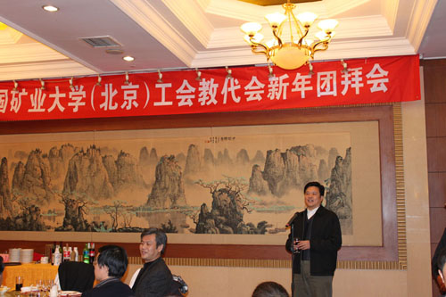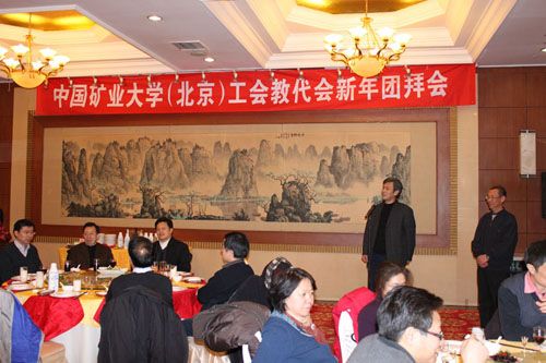 中国矿业大学(北京)校工会于2010年1月21日在西郊宾馆举行了工会和教代会系统新年团拜会。所有在校校领导出席,他们是:校长乔建永、副校长姜耀东、副校长王忠强、校党委副书记兼工会主席朱书全。参加团拜会人员有:党委各部门及相关处室负责人,各党总支书记,学院院长,校工会委员会、经审委员会、女工委员会、劳动人事争议调解委员会、各部门工会委员和教代会执行委员会及各专门工作委员会委员共70余人。团拜会由校工会常务副主席、教代会执行委员会副主任晏学民主持。