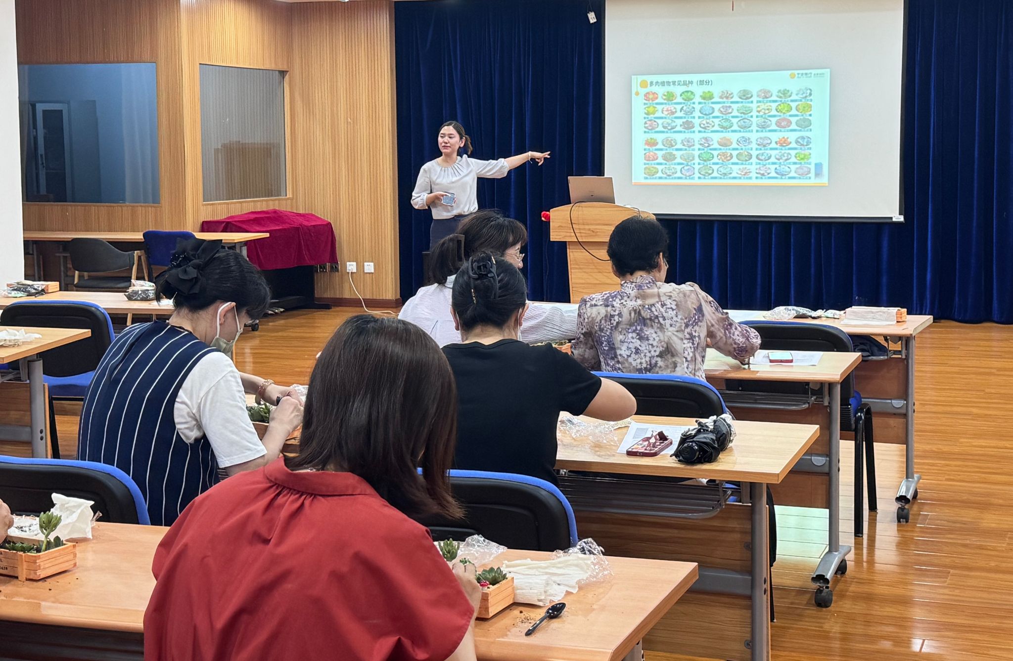 活动中,授课老师系统讲解了多肉植物的种类特征、养护要点及栽培技巧,并现场指导教职工亲自动手完成多肉植物盆景创作。大家在实践中感受绿色手作的魅力,现场氛围轻松热烈,既增进了互动交流,又收获了劳动与创意的乐趣。