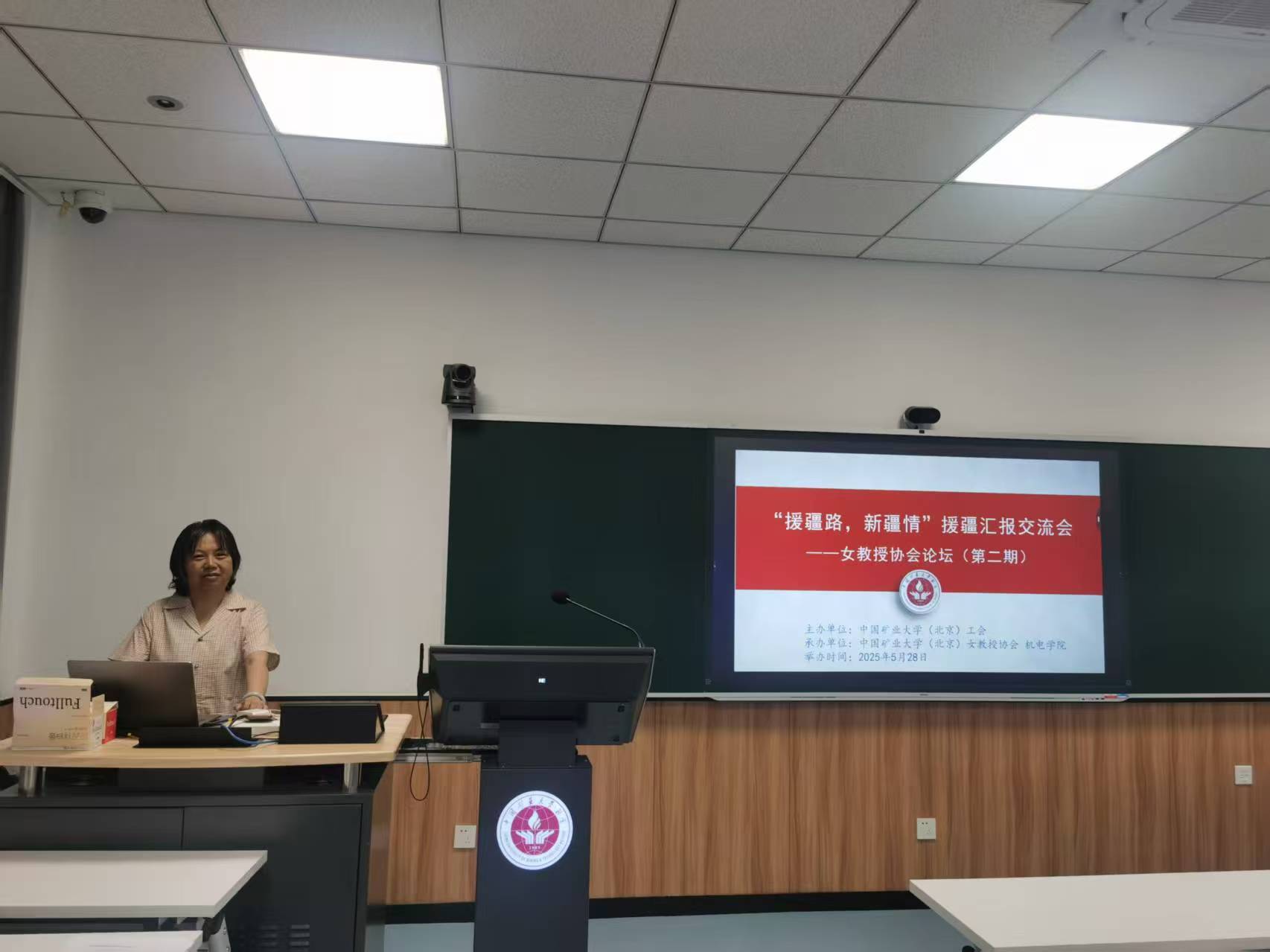 5月29日下午,由校工会主办、校女教授协会与机电学院工会承办的“援疆路,新疆情”援疆汇报交流会在教学楼214智慧教室举行。中国矿业大学(北京)朱红秀教授作为主讲嘉宾,深情分享了她在新疆工程学院的教育援疆历程与感悟。校工会常务副主席刘岩出席会议,共计20余名师生参加了活动,论坛由校女教授协会机电学院机器人系李艳老师主持。
