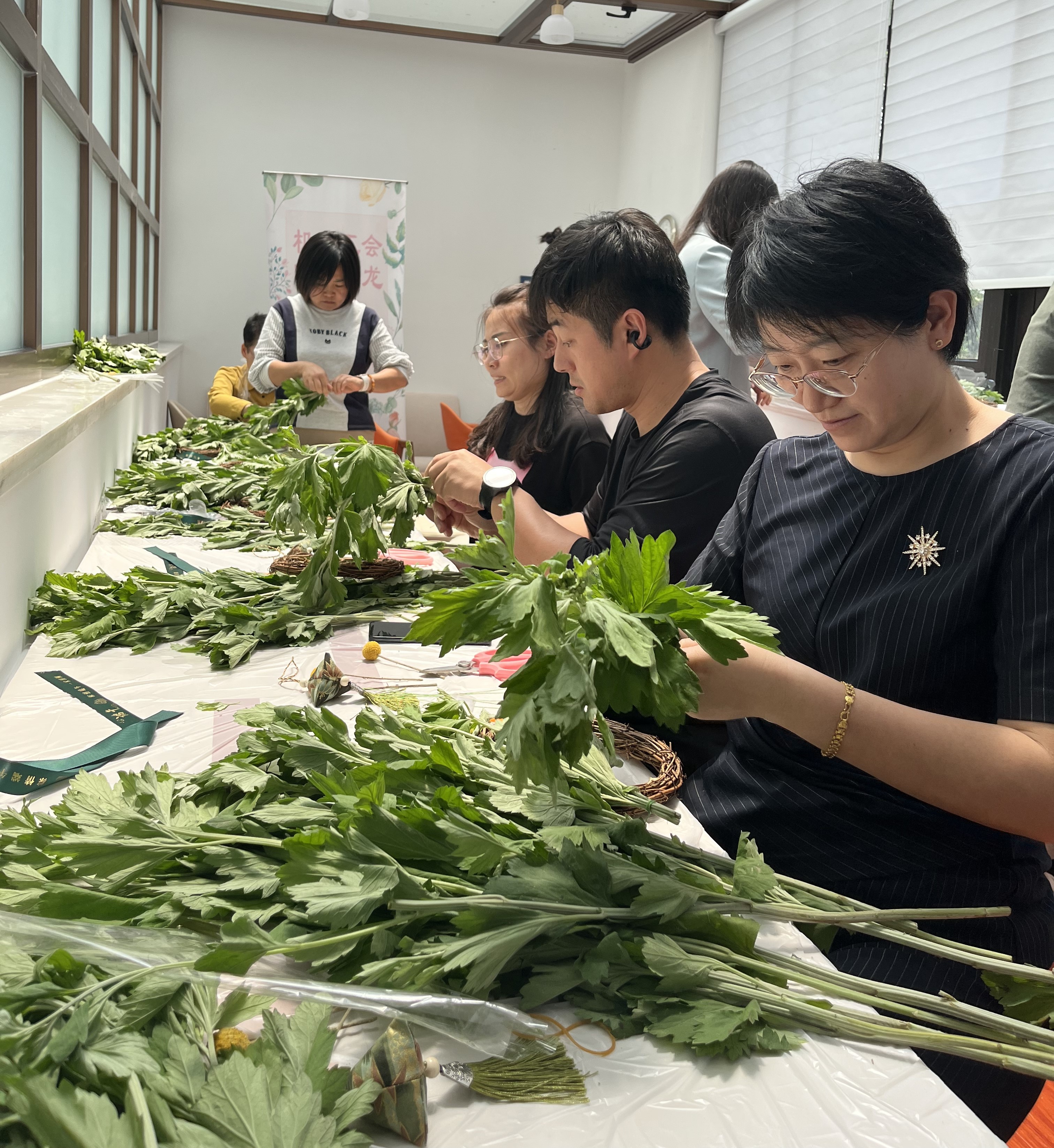 活动现场,浓郁的艾草清香扑面而来,桌上整齐摆放着鲜嫩的艾草、色彩缤纷的绸带、精致的配饰等制作材料。首先,专业老师详细介绍了端午节悬挂艾草和菖蒲的传统习俗和美好寓意。传说菖蒲被认为是天中五瑞之首,而艾草则代表百福,挂在门前,是为清洁空气、消除病毒、期许身体强健之意。随后,专业老师详细讲解艾草花环的制作步骤和技巧,从艾草的挑选、捆绑,到花环的塑形、装饰,每一个环节都进行了指导和示范。教职工们热情高涨,纷纷投入到制作中。大家一边相互交流,一边认真地将艾草修剪整齐、有序缠绕,再用绸带精心装饰。在一双双巧手下,形态各异、充满创意的艾草花环逐渐成型。制作过程中,欢声笑语不断,大家沉浸在传统手工艺的乐趣中,现场洋溢着浓厚的节日氛围。