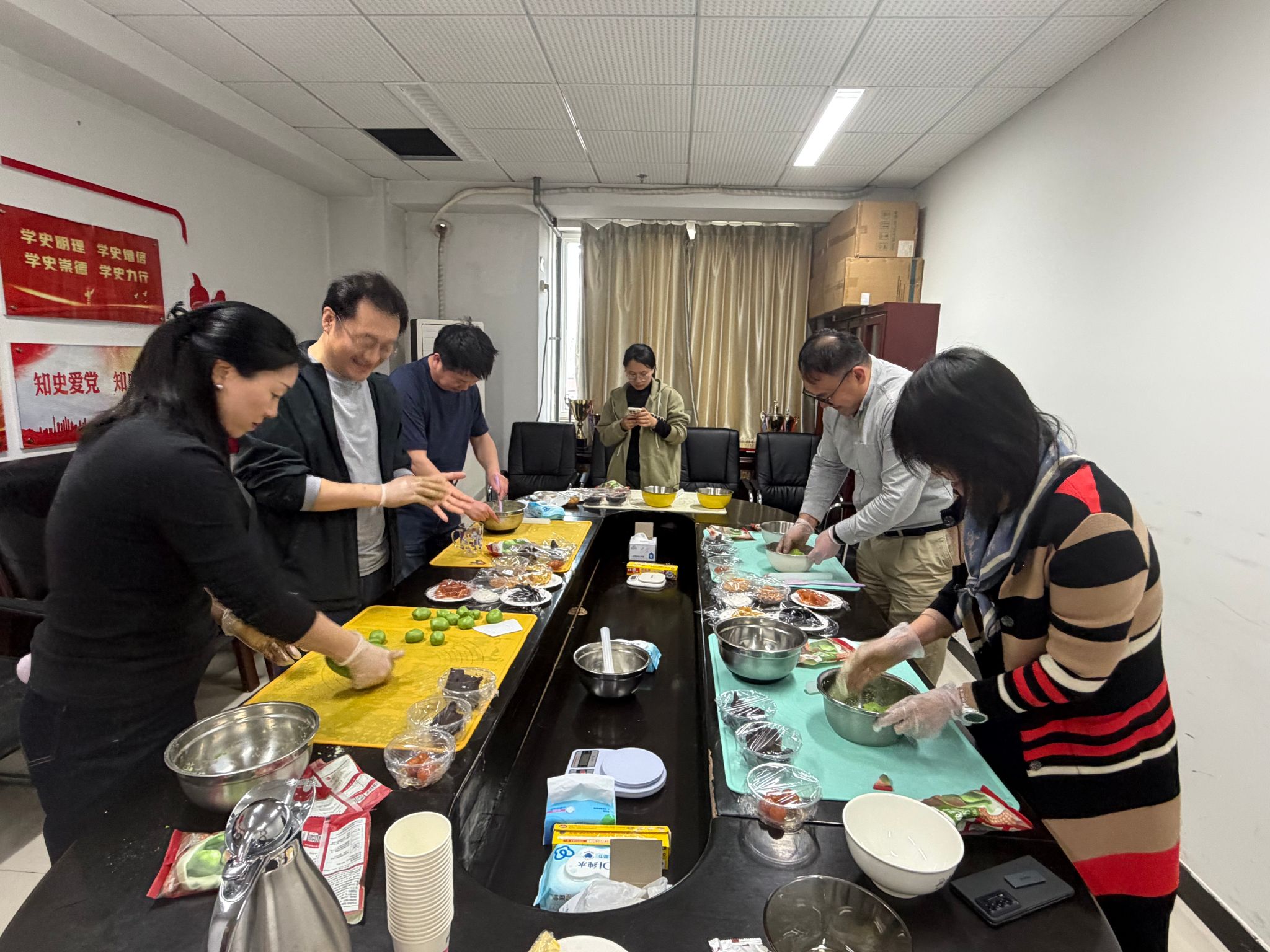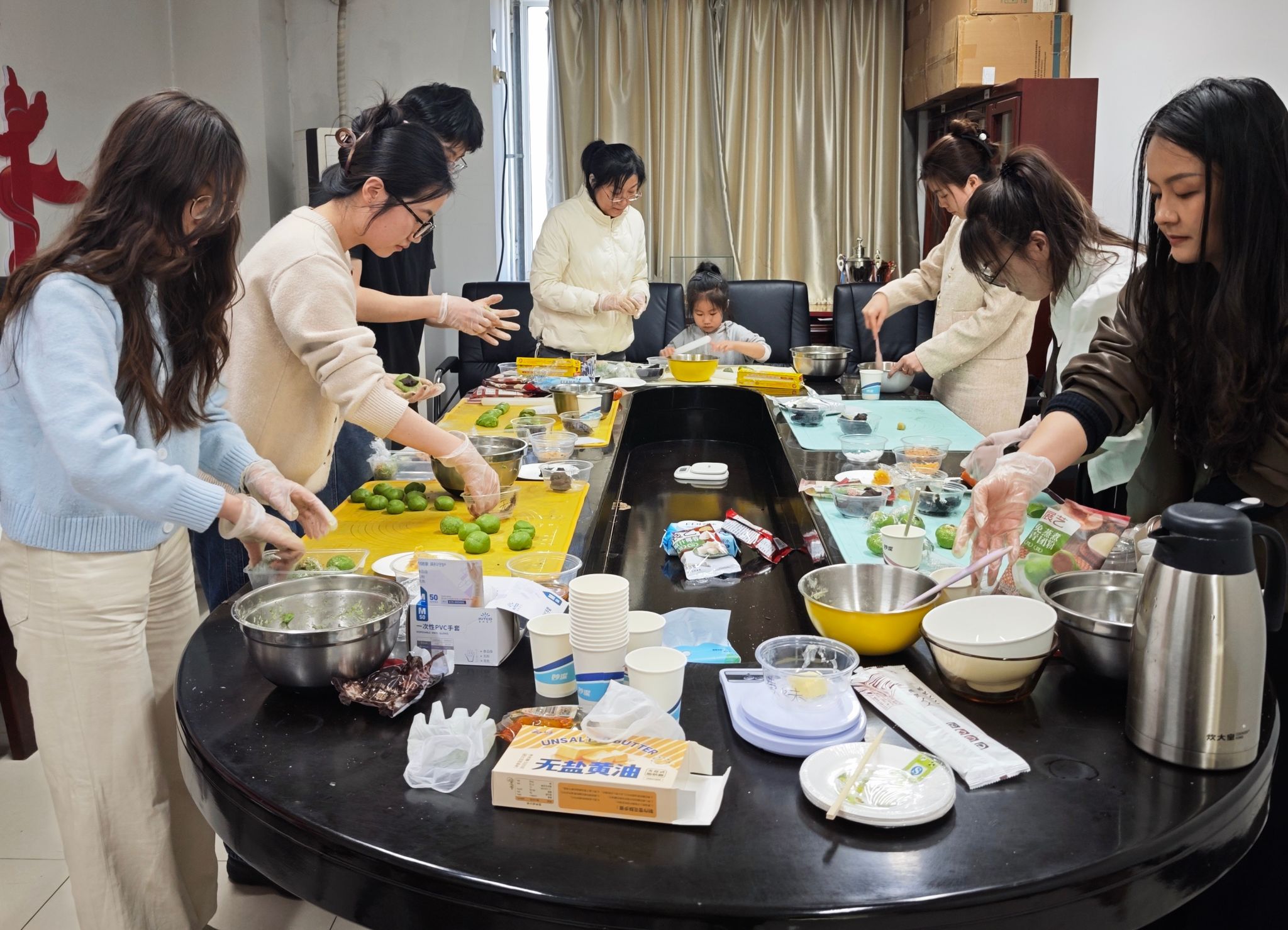 活动现场布置得温馨雅致,充满了春日的气息。办公室党支部提前精心准备了制作青团所需的糯米粉、豆沙馅、蛋黄肉松馅等各种新鲜食材和工具,老师们兴致勃勃地投入到青团的制作过程中。揉面、包馅、塑形……平时专注于教学科研的老师们此刻化身“点心师傅”,一边交流技巧,一边亲手实践。现场气氛热烈,欢声笑语不断。有的老师手法娴熟,做出的青团圆润饱满;有的老师则创意十足,为青团赋予了别致的造型。在忙碌而愉悦的协作中,一个个碧绿如玉、散发着淡淡艾草清香的青团逐渐成形,整齐地摆放在包装盒中,清新的香气弥漫在整个活动室,令人欣喜不已。